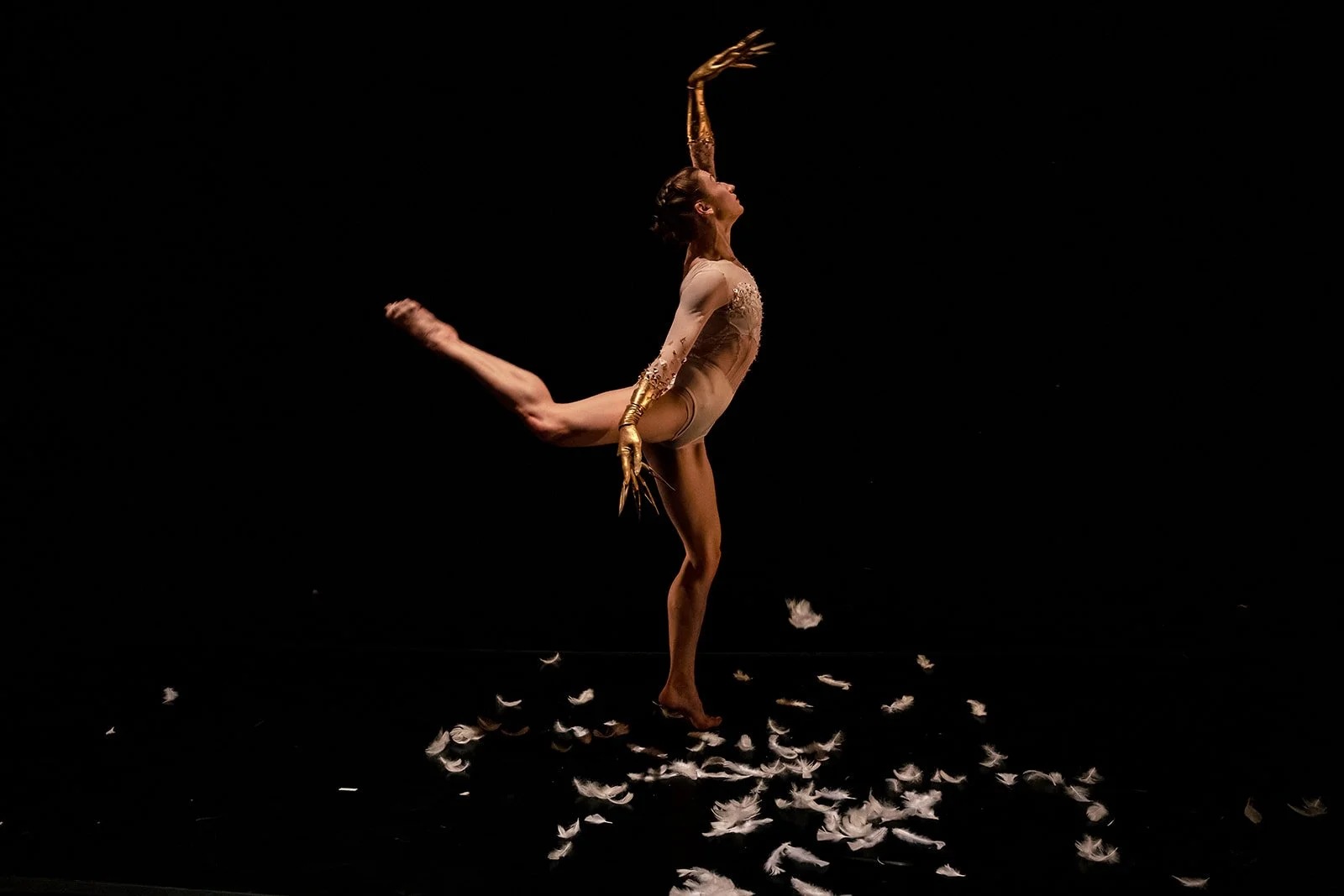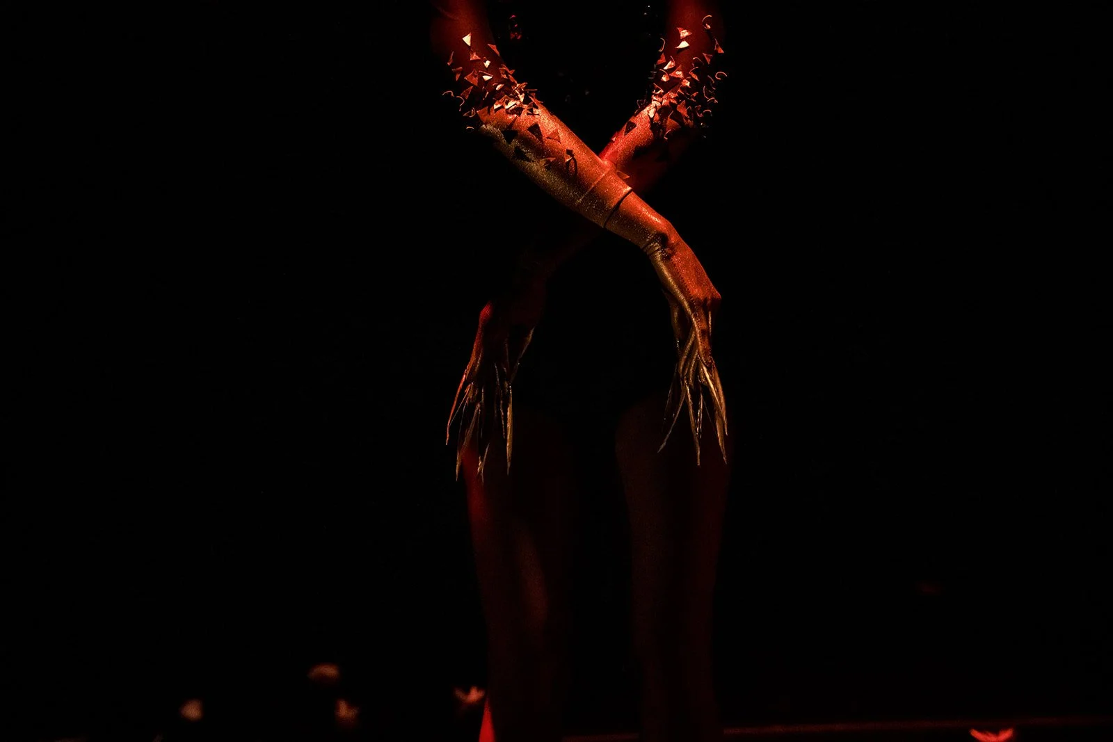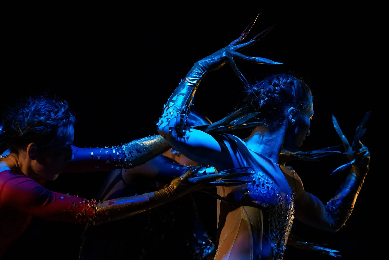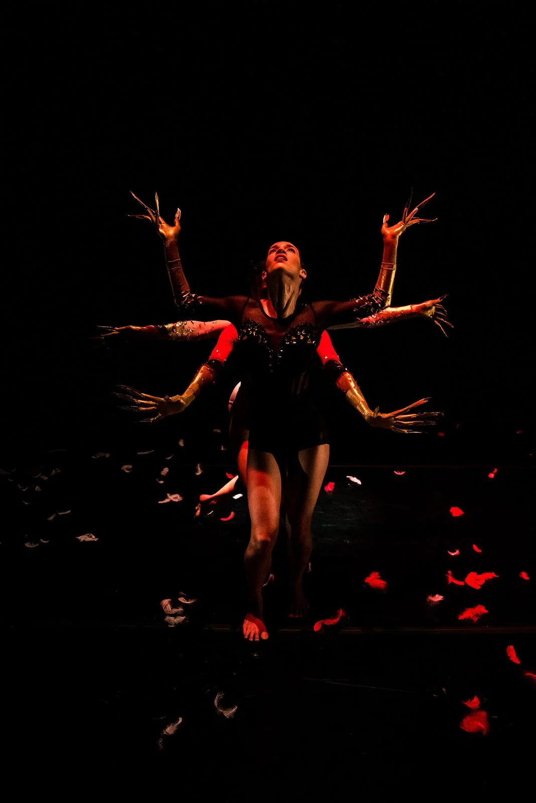 Exploring the psychology of grandiose delusion, made visible in the elongated golden hands of the dancers. The performers change moods unpredictably, moving quickly from soft grace to cutting speed and precision. Drawing inspiration from the element mercury, a toxic metallic liquid.